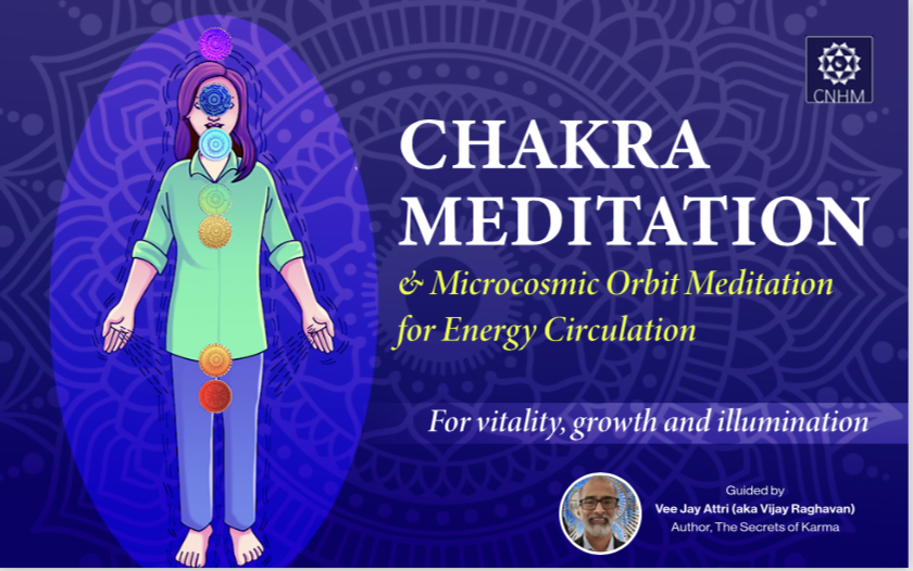In the Chakra meditation guided by Master Vijay Raghavan, you will meditate on the seven major Chakras in a sequence and chant the ‘seed’ mantra for that Chakra. After chanting the mantra, you may visualise the organs or parts of the body governed by the Chakra filled with white light and affirm that the organ or part of the body is healthy.