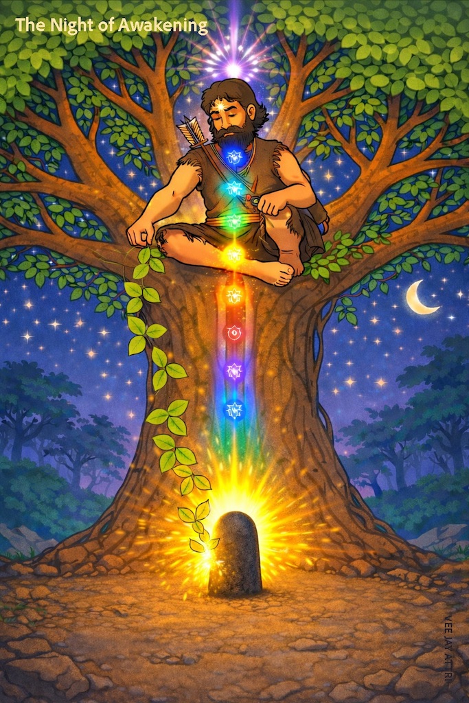Staying awake symbolises awareness in darkness — as witness or detached observer (Sakshi Bhav). Alertness is the seed of awakening.